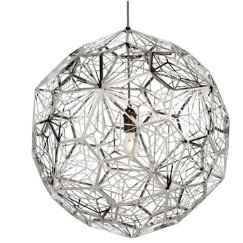 ETCH WEB is a vast 60cm wide shade with an unusual open structure, designed to cast atmospheric angular shadows when lit. Another experiment in our long running exploration of mathematics and geometry, an irregular pentagon shape is repeated 60 times across the body to create a total sphere.